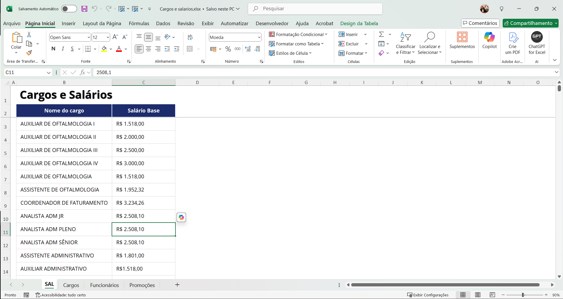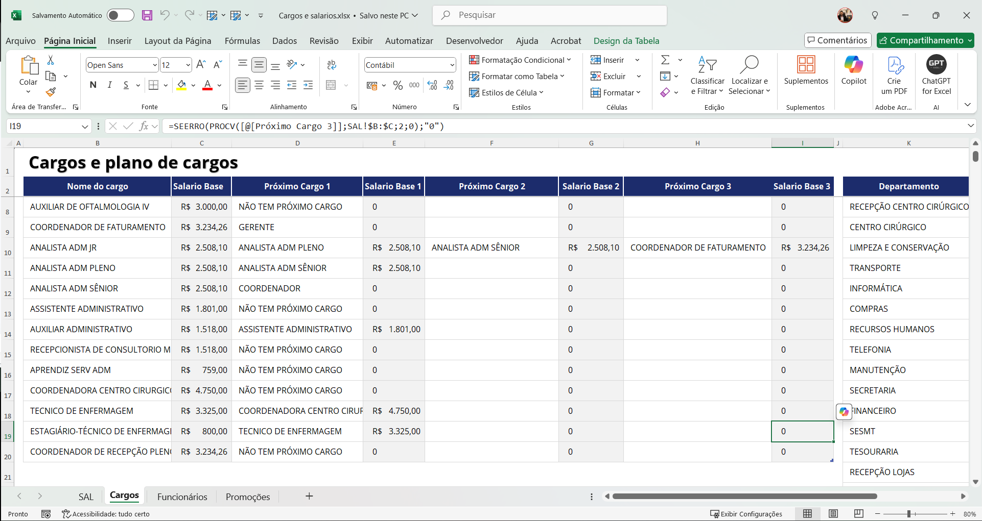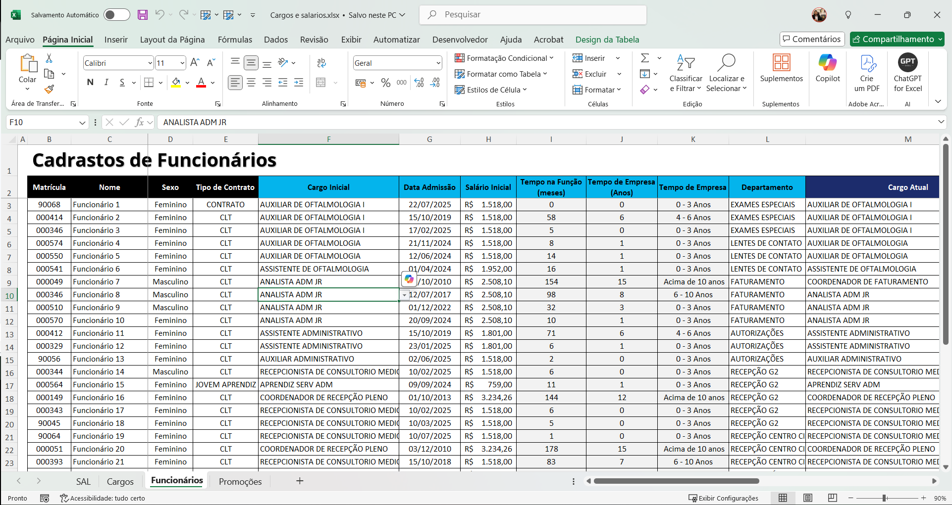 Relatório completo de cargos e salários com valores atualizados, cargos iniciais e próximos cargos da trilha de carreira.