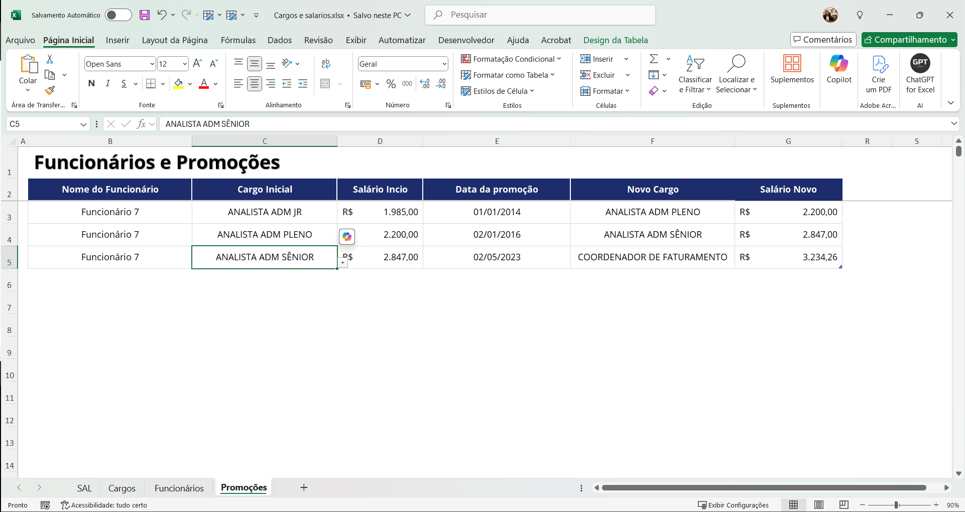 Análise de promoções com histórico de cargos anteriores, datas de promoções e novos salários.