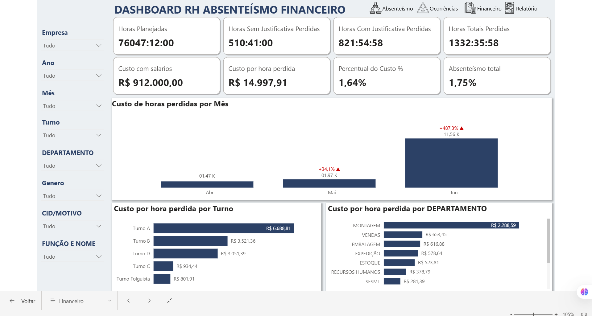 ✅ Indicadores Financeiros – saiba exatamente o custo das horas perdidas, impacto no orçamento e distribuição por departamento e turno.