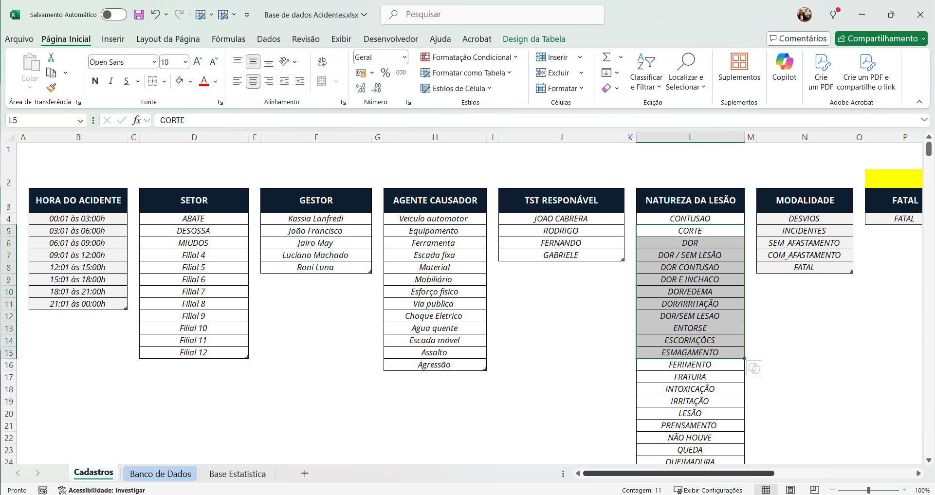 Base de dados estruturada em Excel, totalmente editável, incluindo cadastros, banco de dados e estatísticas para alimentar o Power BI.