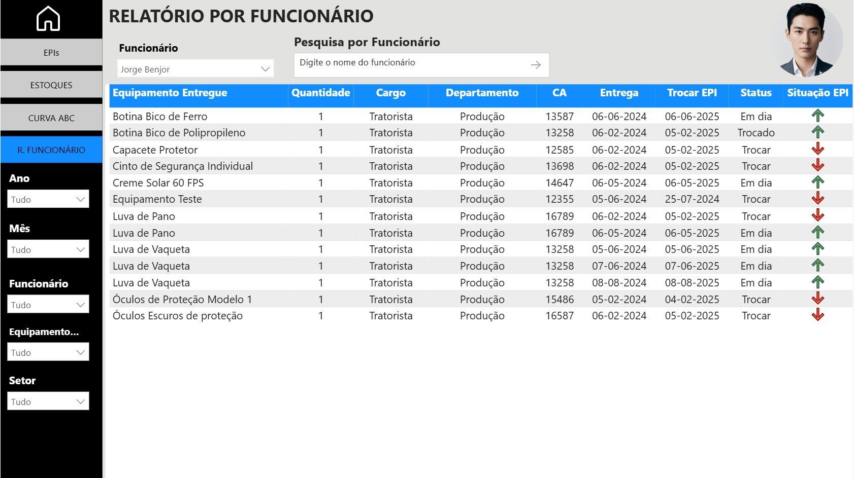 Com esse dashboard, você terá uma visão completa de todo o ciclo de EPIs, desde a compra, entrega e uso pelos colaboradores até o controle de prazos e trocas, garantindo conformidade com as normas de segurança do trabalho (SST) e reduzindo custos operacionais.