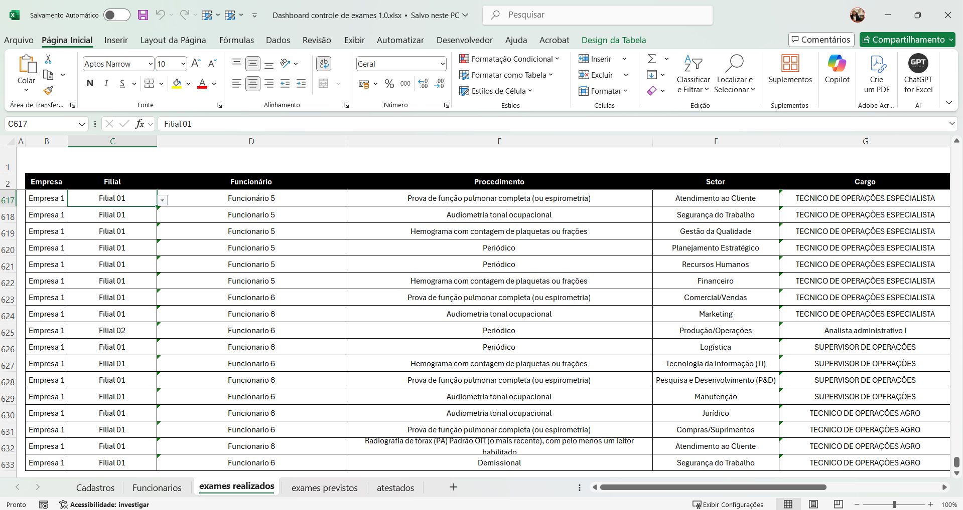 Controle de funcionários ativos por setor, cargo, filial, sexo e idade.