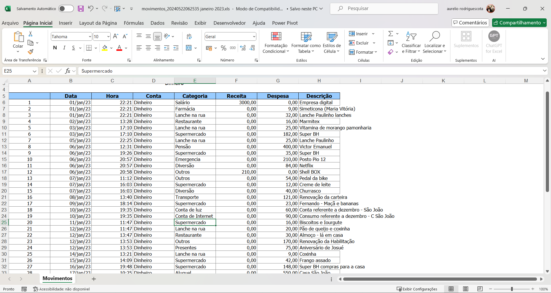 Controle por categoria (supermercado, transporte, aluguel, lazer, saúde, etc.);