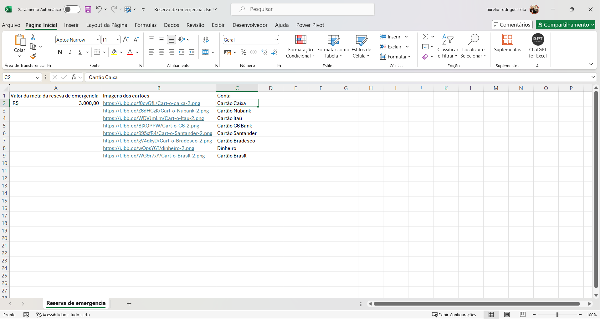 Gestão da reserva de emergência, com cálculo percentual em relação à meta;