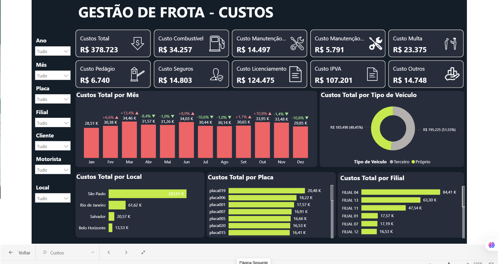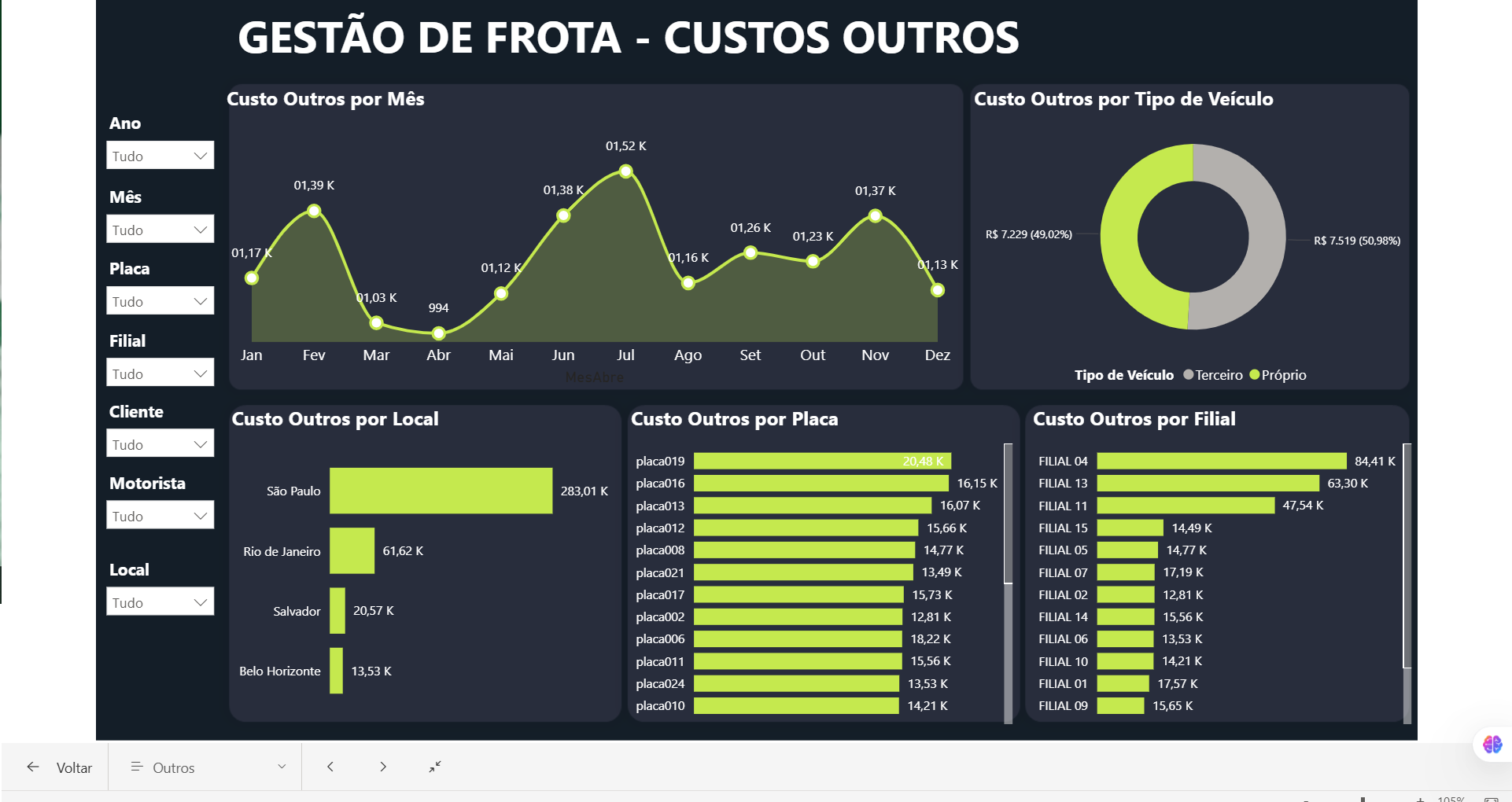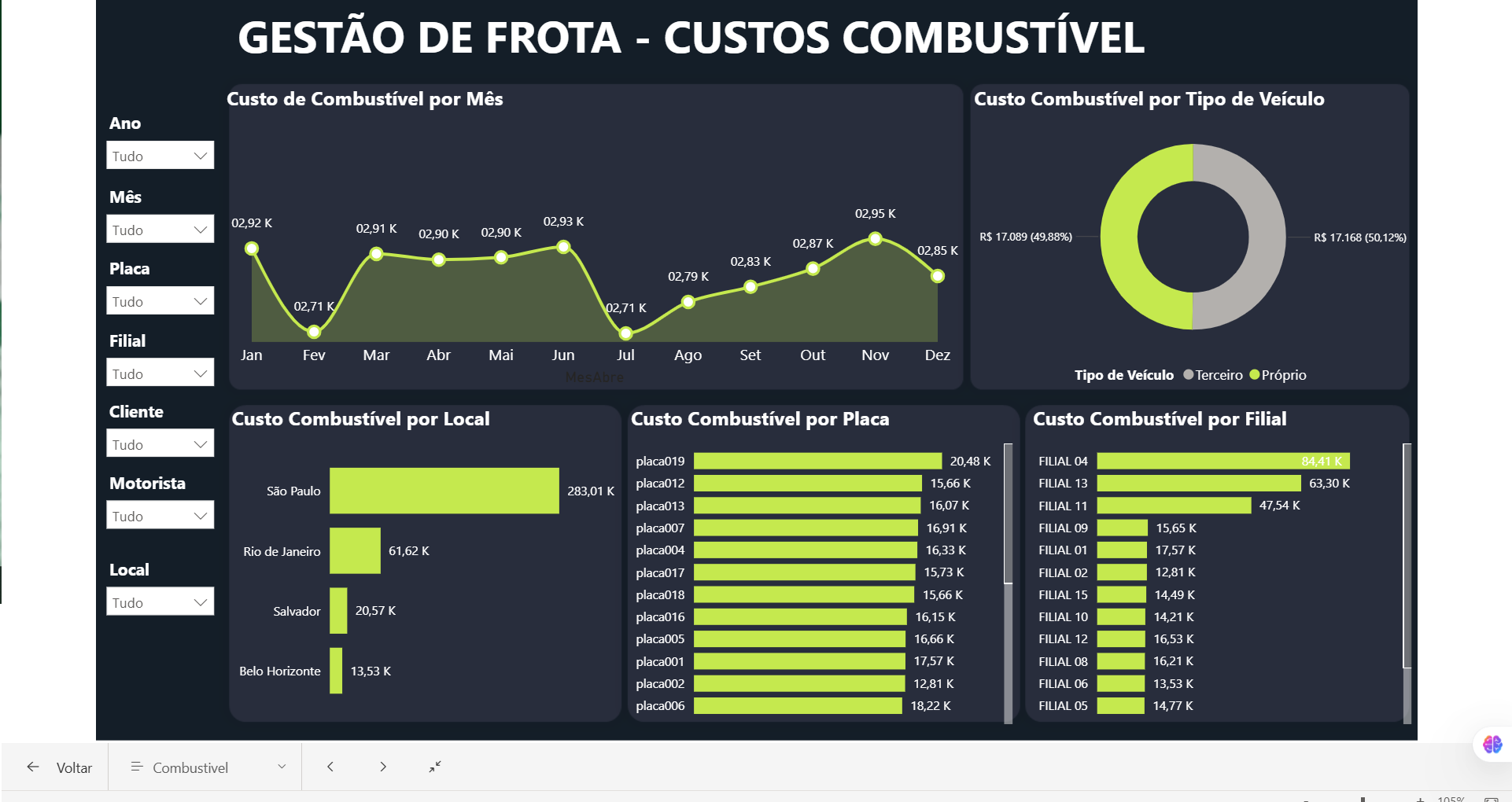 Filtros dinâmicos por ano, mês, cliente, local e veículo;