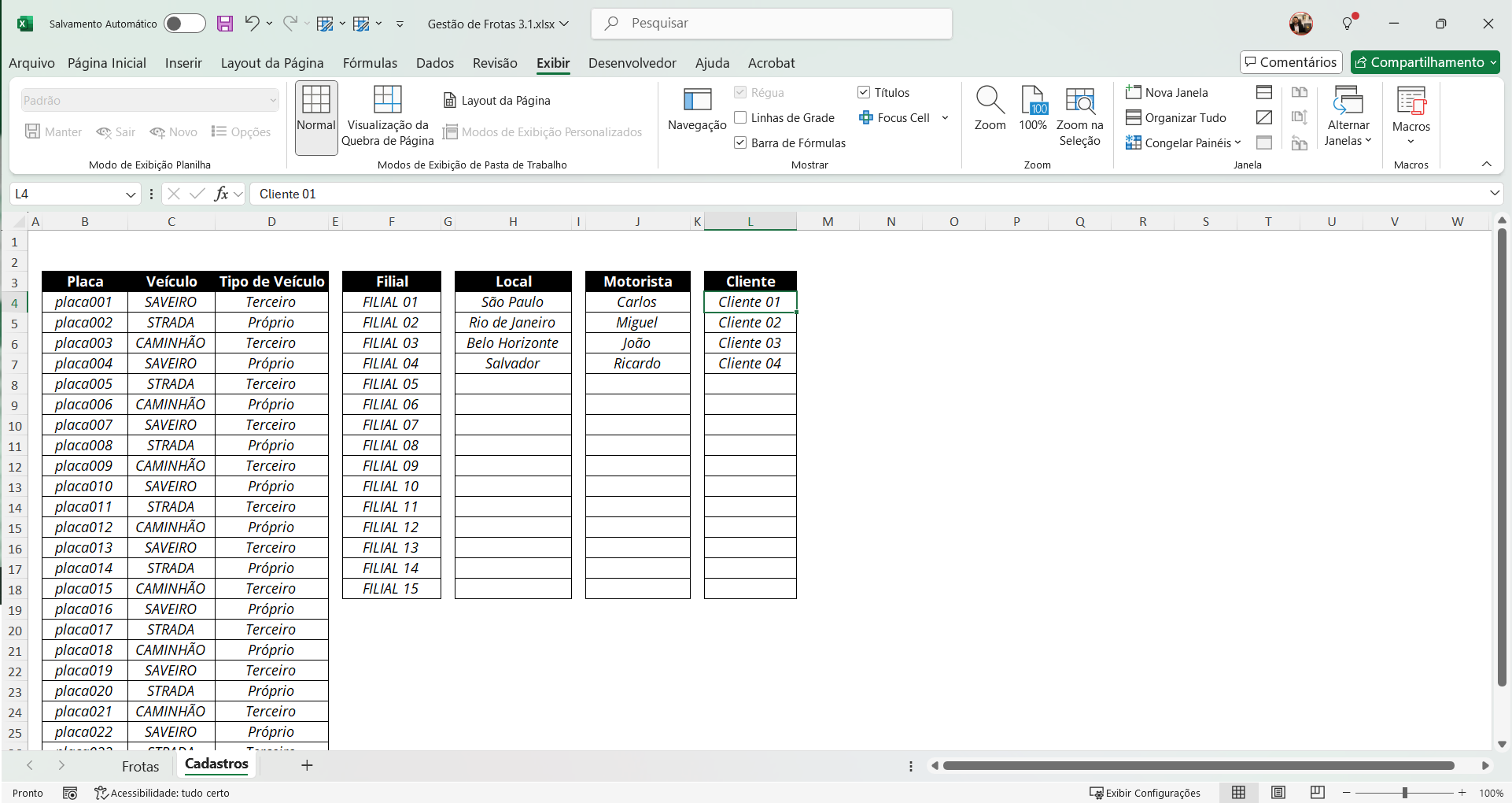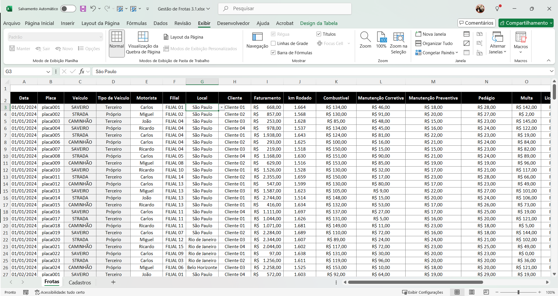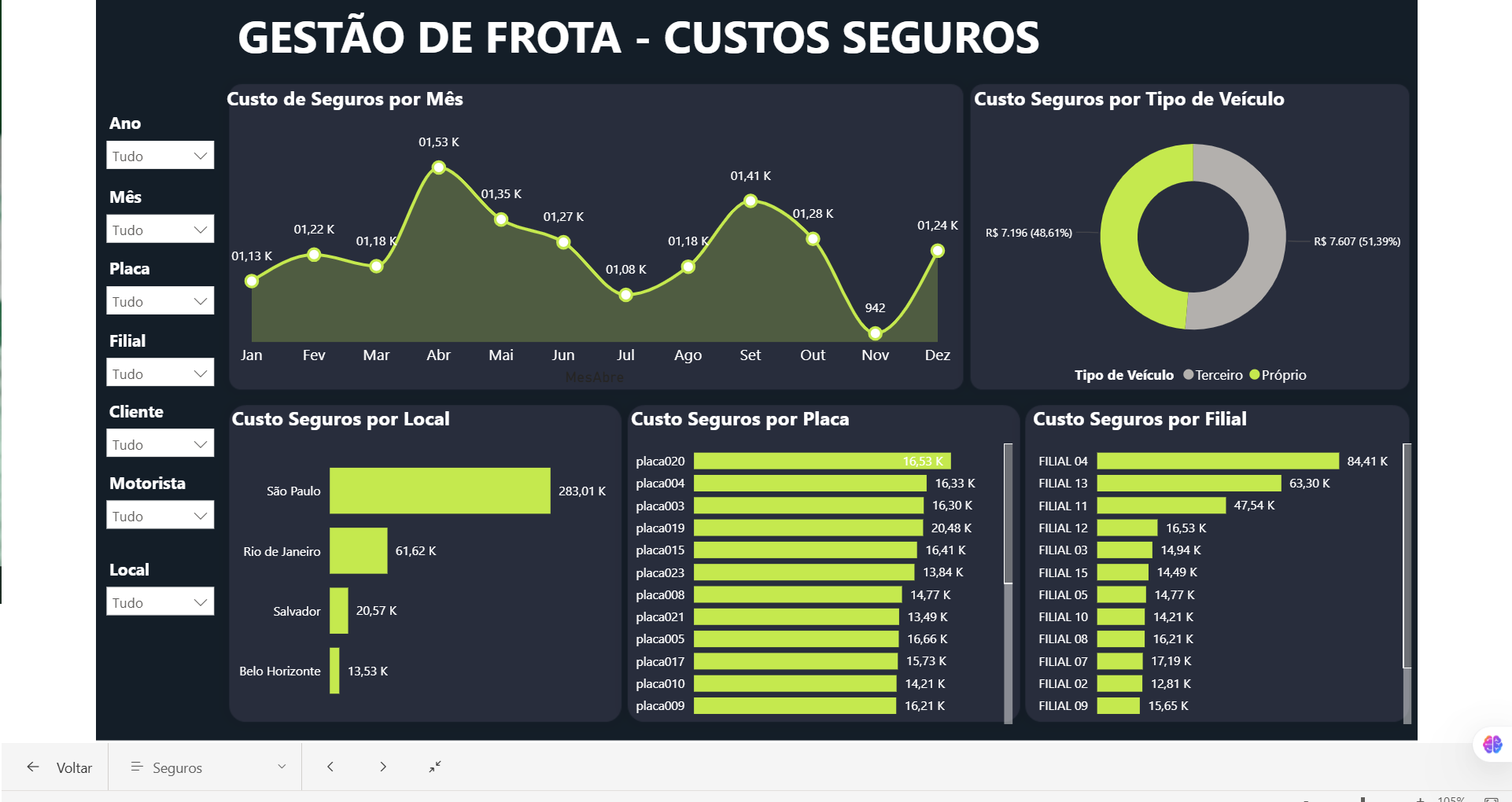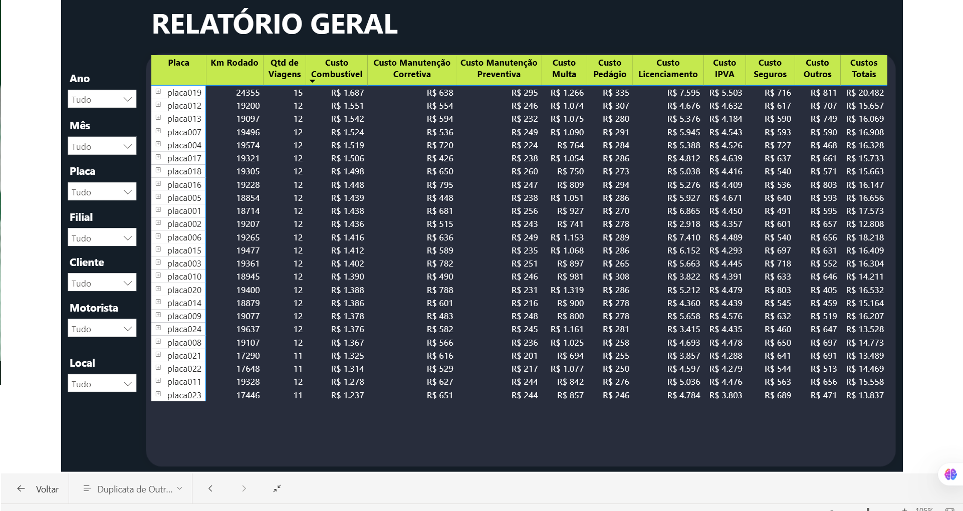 Filtros dinâmicos por ano, mês, cliente, local e veículo;