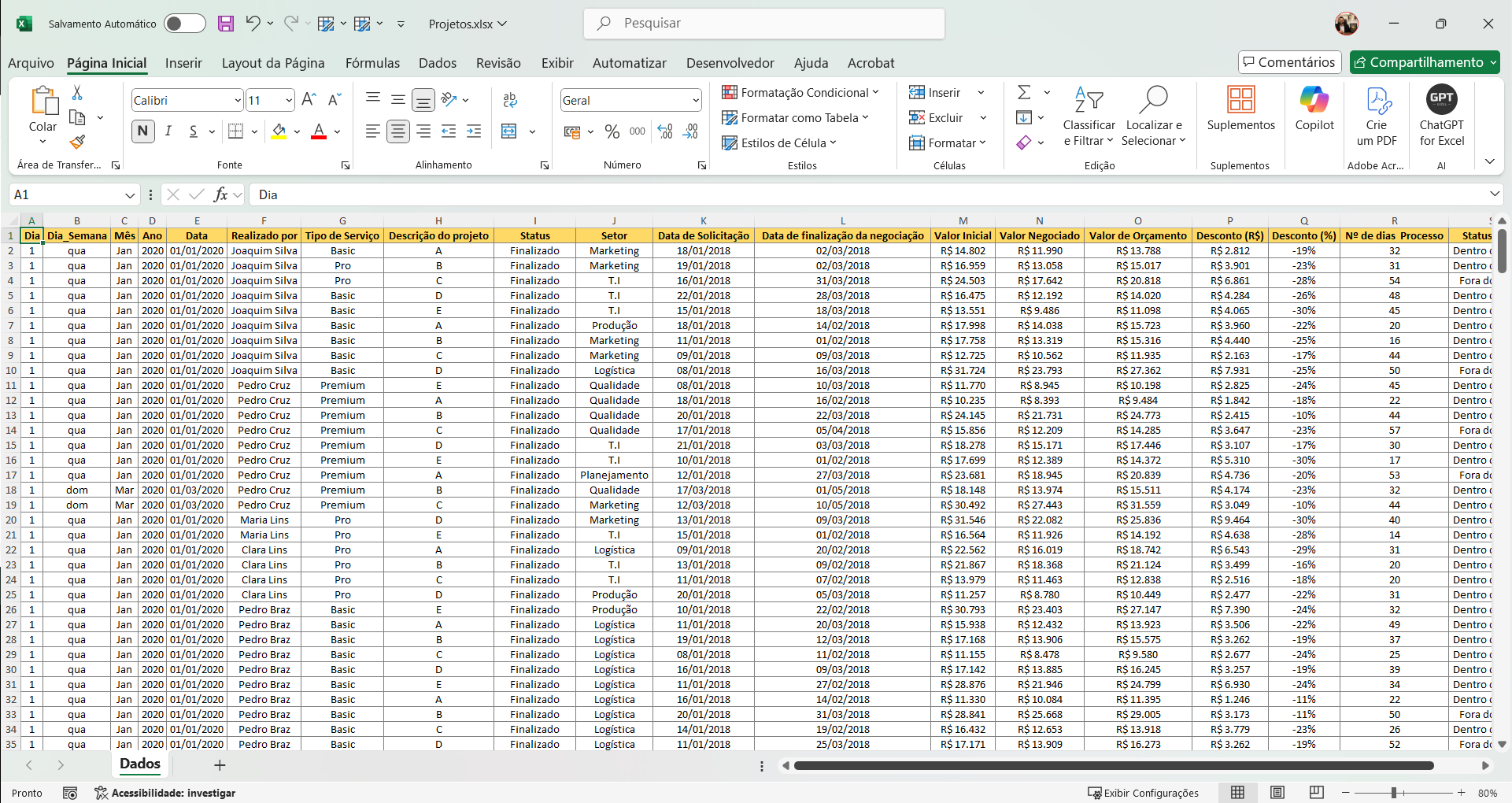 O Dashboard Gestão de Projetos 1.0 no Power BI é a solução ideal para empresas que desejam acompanhar e controlar seus projetos de forma prática, visual e estratégica. Com ele, você terá uma visão completa sobre prazos, valores orçados e realizados, descontos aplicados, desempenho por setor, colaboradores responsáveis e tipos de serviços executados.