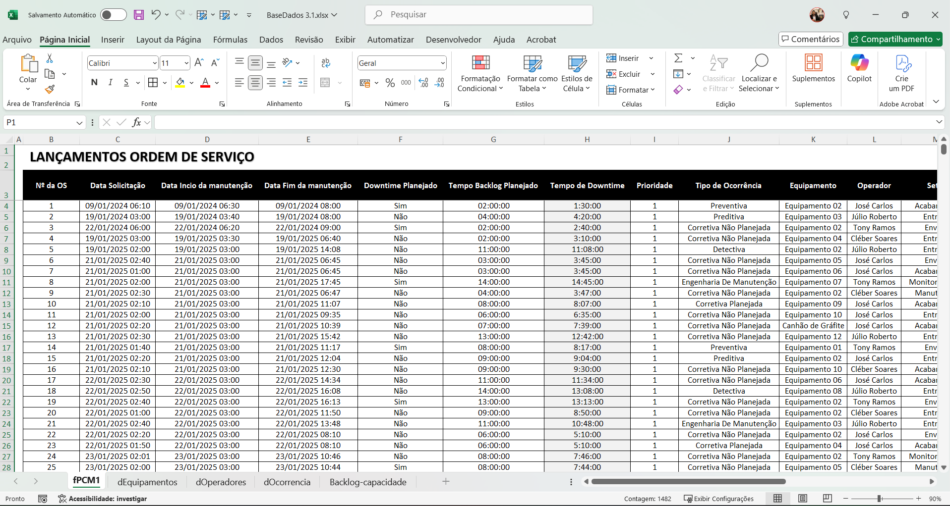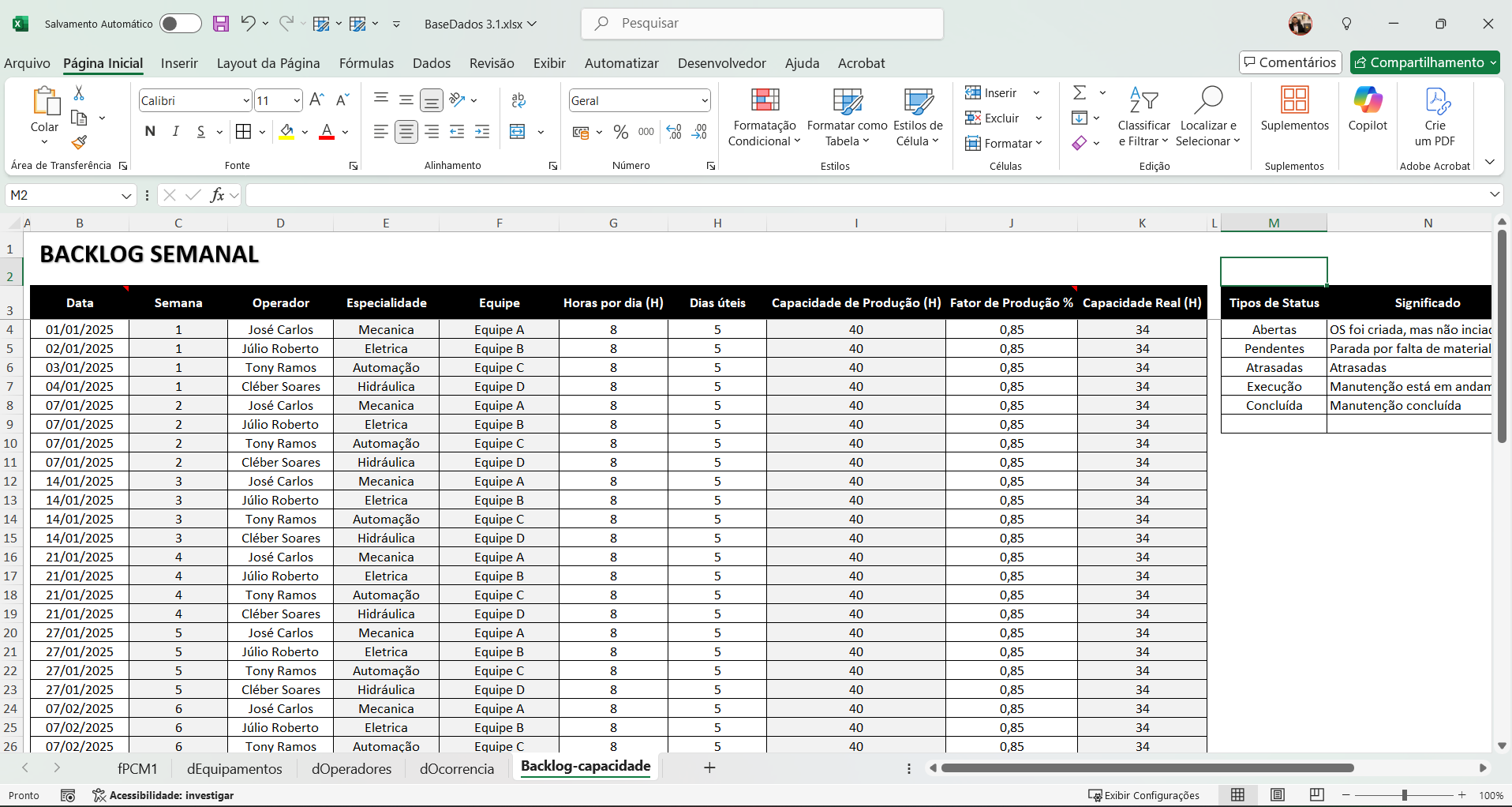 ✅ Backlog de Manutenção – Acompanhe horas planejadas, horas concluídas, saldo de backlog e a evolução da capacidade real de atendimento por período.
