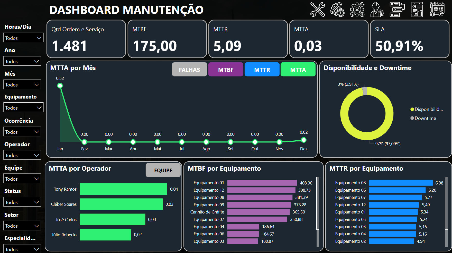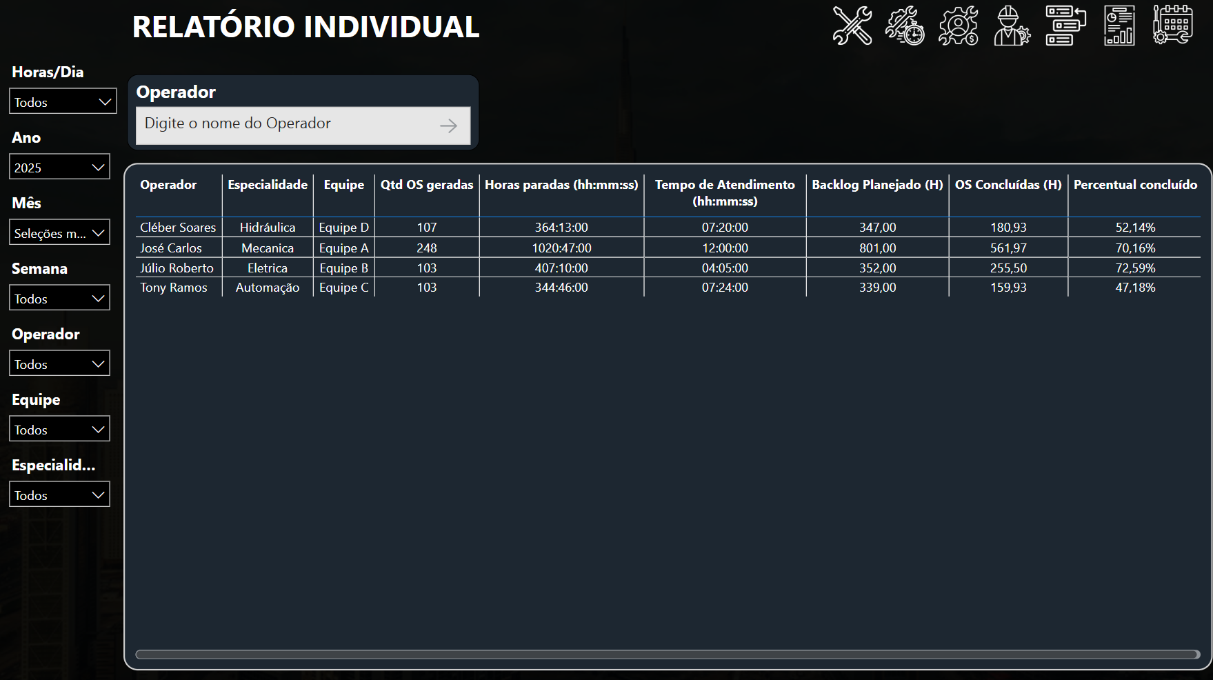 Flexibilidade total com filtros dinâmicos (ano, mês, semana, equipe, operador, especialidade, status, setor e equipamento).