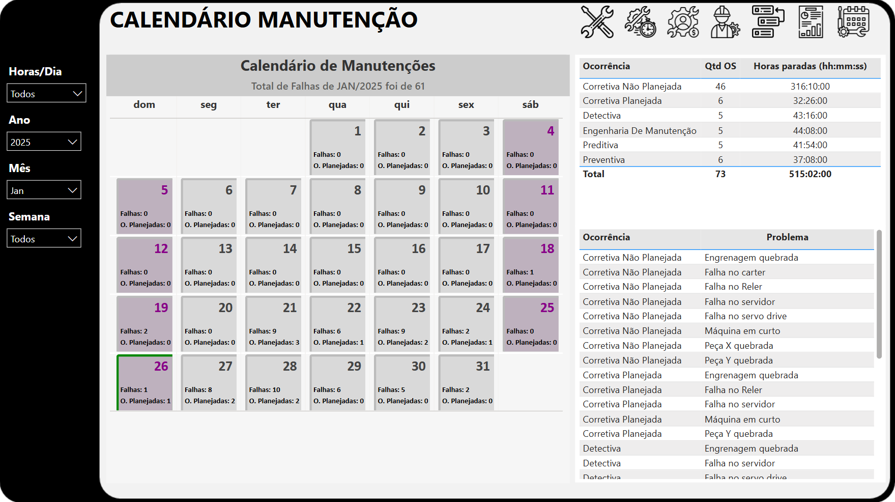 ✅ Calendário de Manutenções – Visualize falhas e ordens planejadas por dia, tipos de ocorrência e problemas registrados.