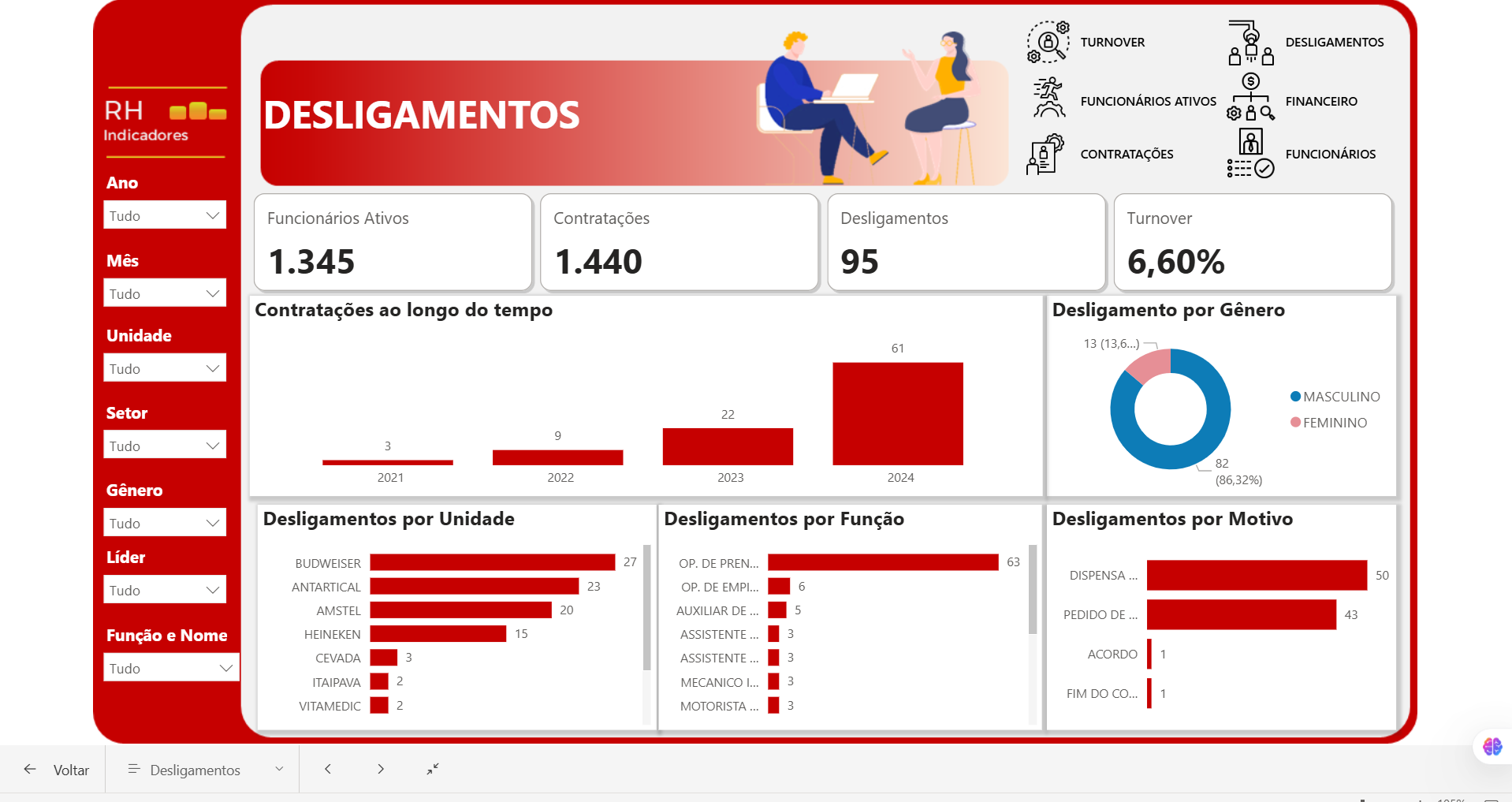 ✅ Desligamentos – entenda os principais motivos e distribuições por área, função, gênero e período.
