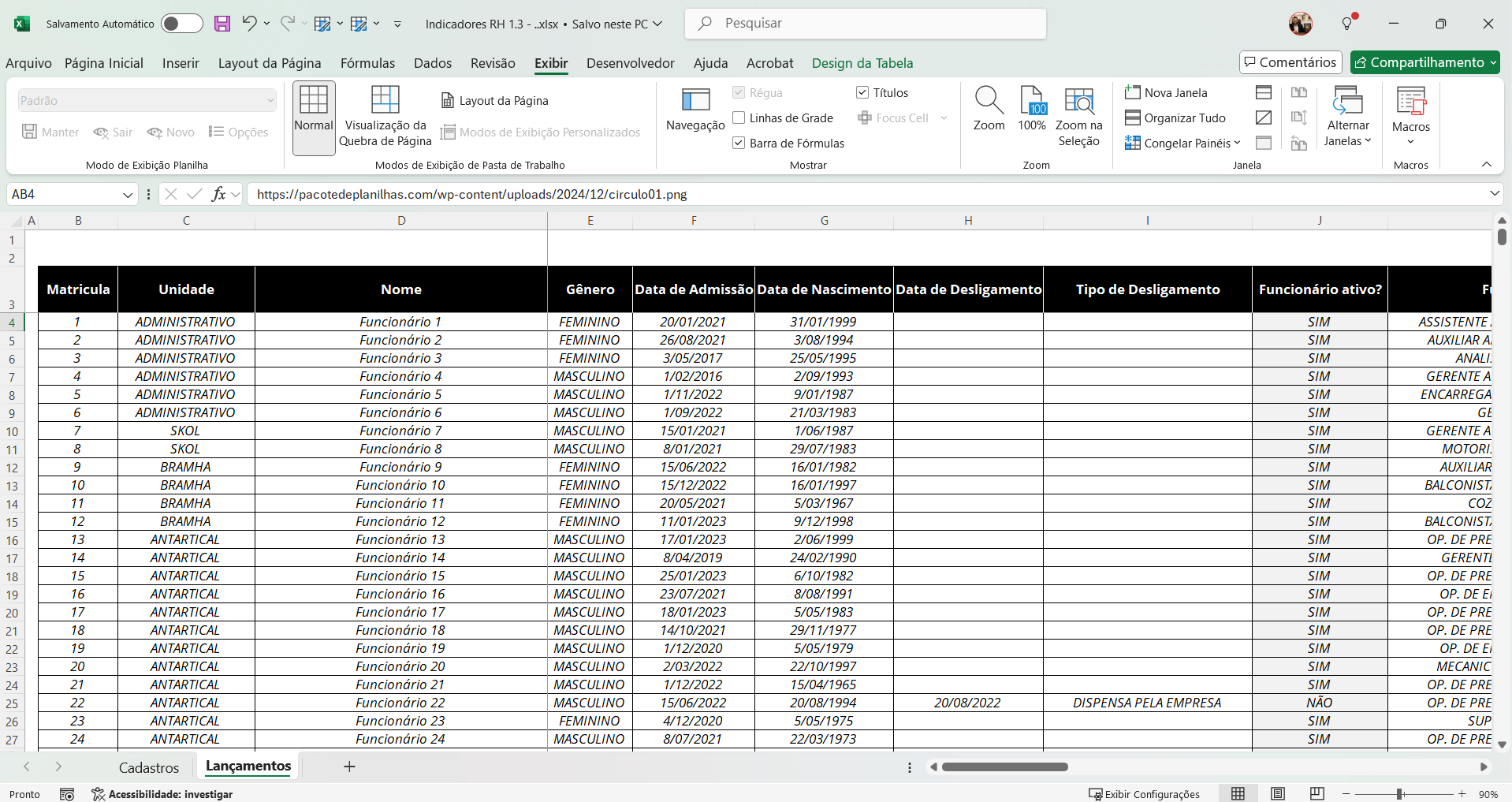 ✅ Funcionários Ativos – visão detalhada por gênero, escolaridade, setor, unidade, função, faixa etária e tempo de empresa.