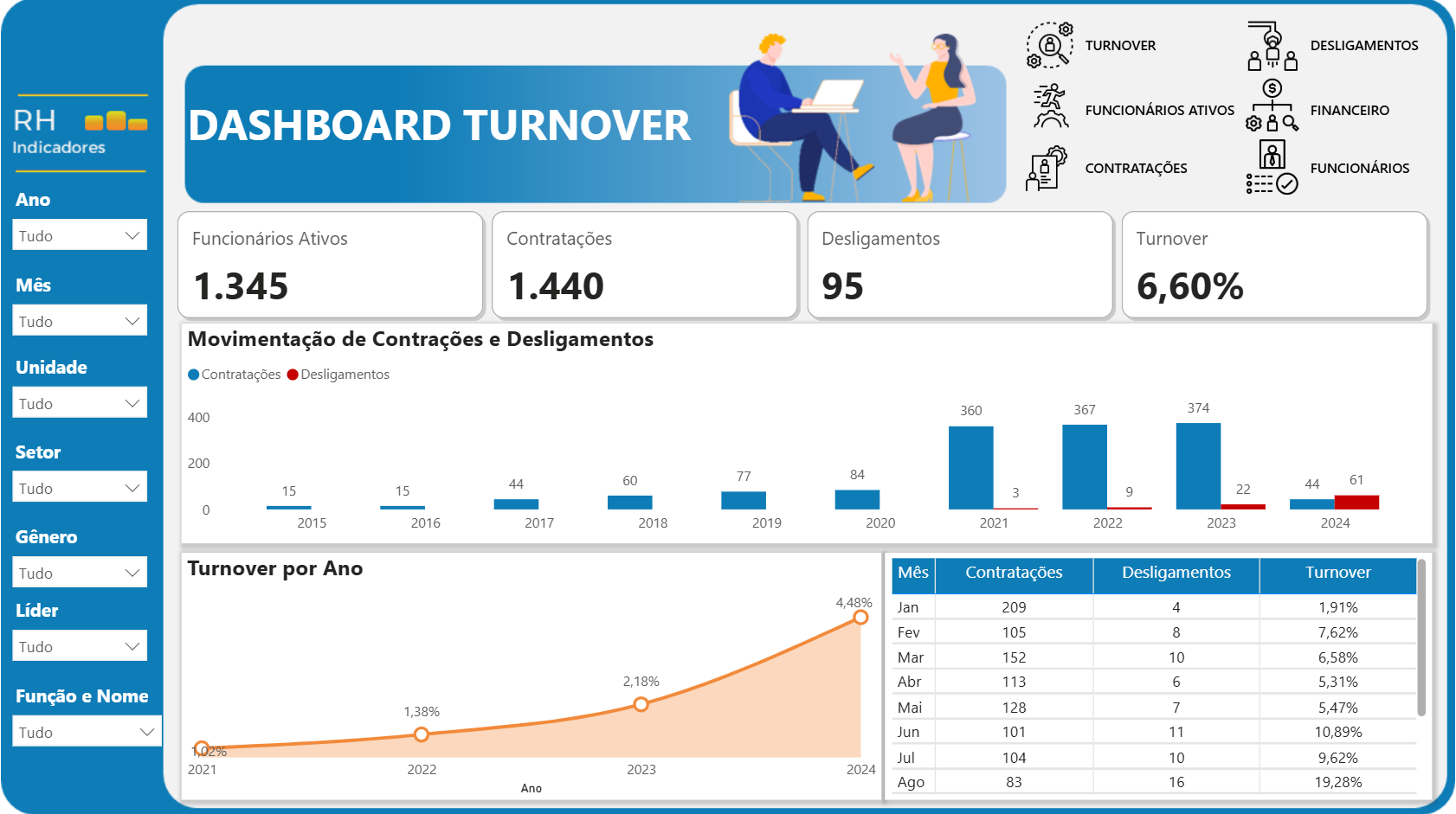 ✅ Filtros Dinâmicos – visualize os dados por ano, mês, unidade, setor, função, gênero, líder e até colaborador específico.